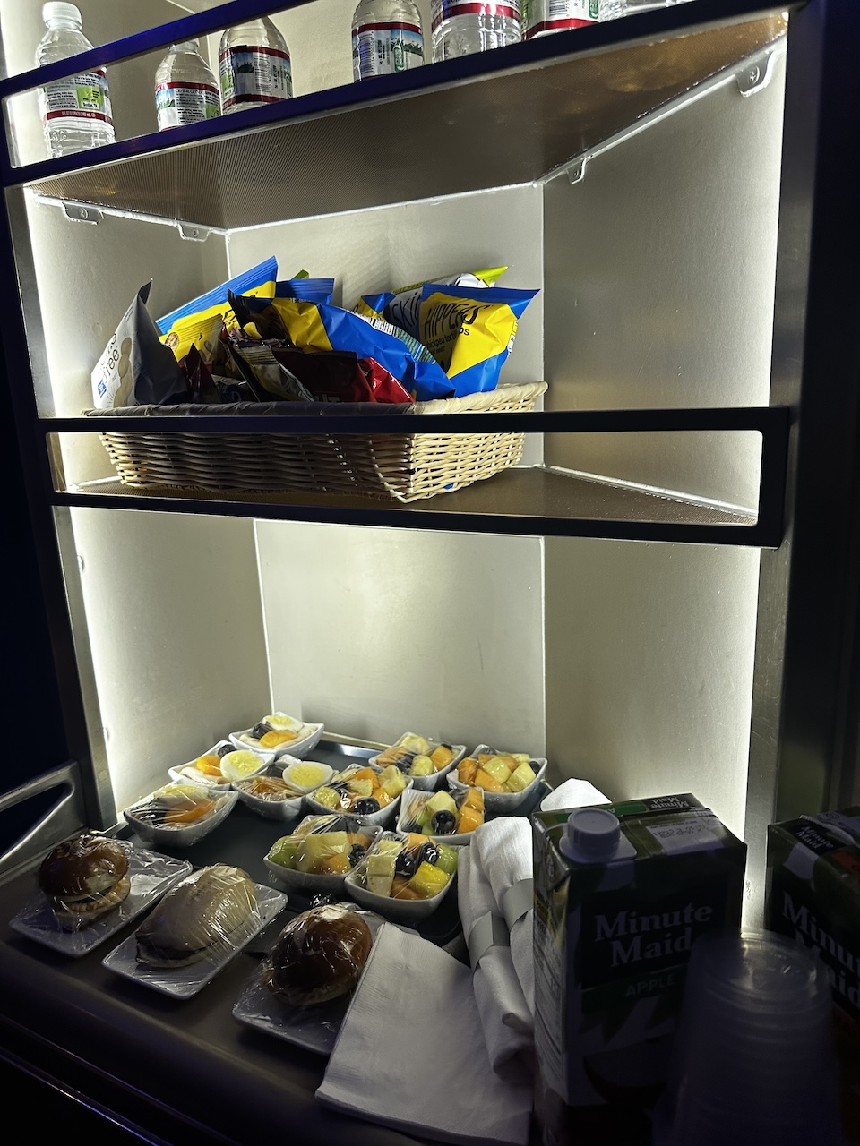 Während des Fluges standen in den Bordküchen Snacks und Getränke zur Selbstbedienung.