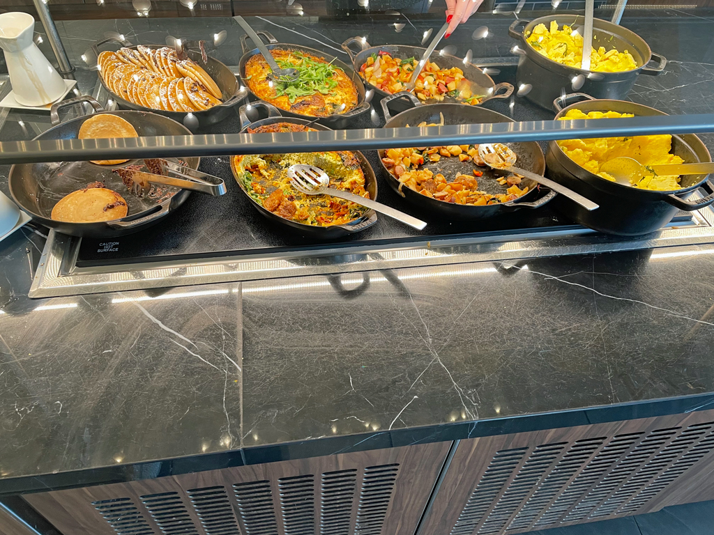 An warmen Speisen gab es Rührei, Frittata, amerikanische Pfannkuchen, Bratkartoffeln und verschiedene Suppen. Es gab geschnittenes Obst und Gemüse, Kuchen, Cookies, Muffins usw.