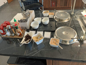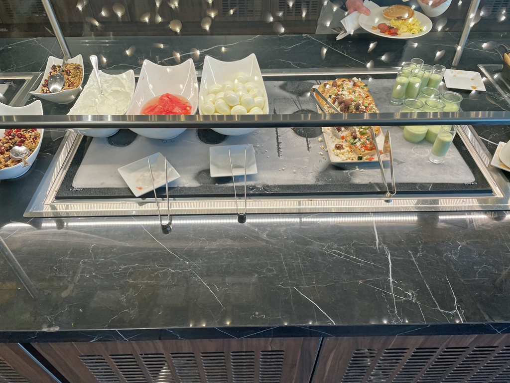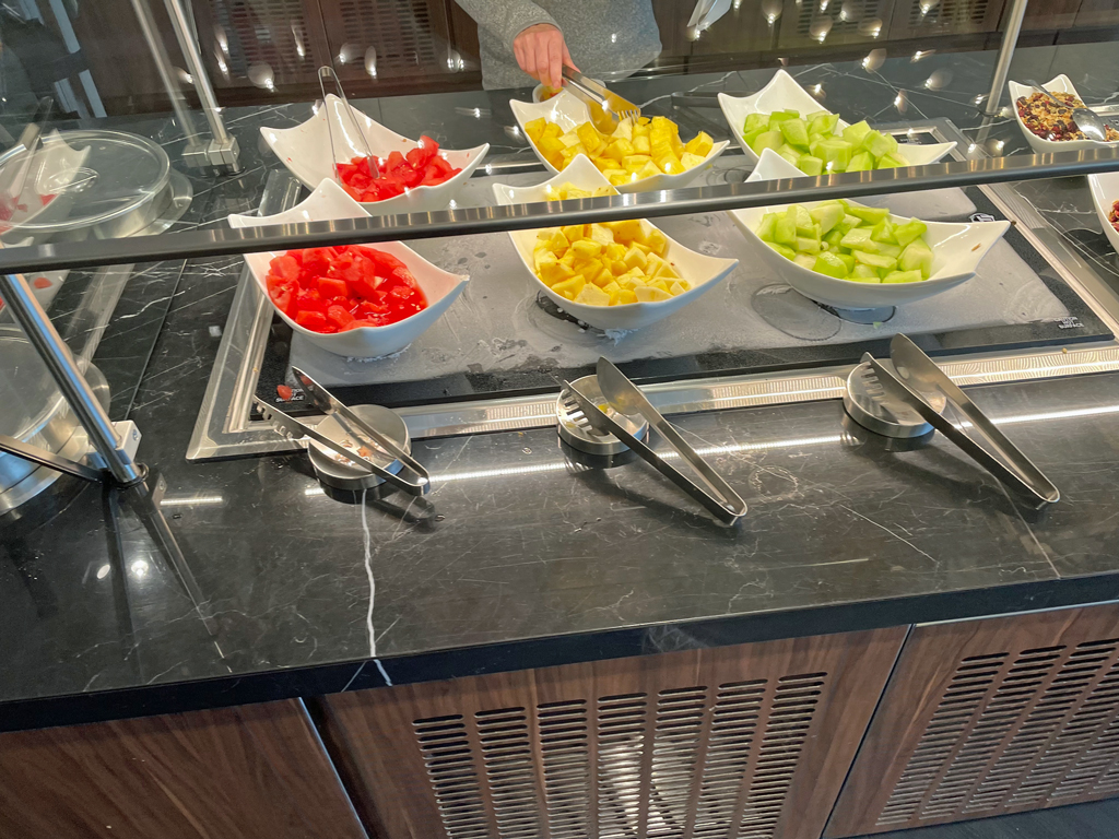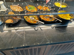 Das Essen wird als Buffet zur Verfügung gestellt. Bereits um halb acht morgens gab es eine Auswahl an Gerichten, die eher ein Brunch denn ein reines Frühstück waren.