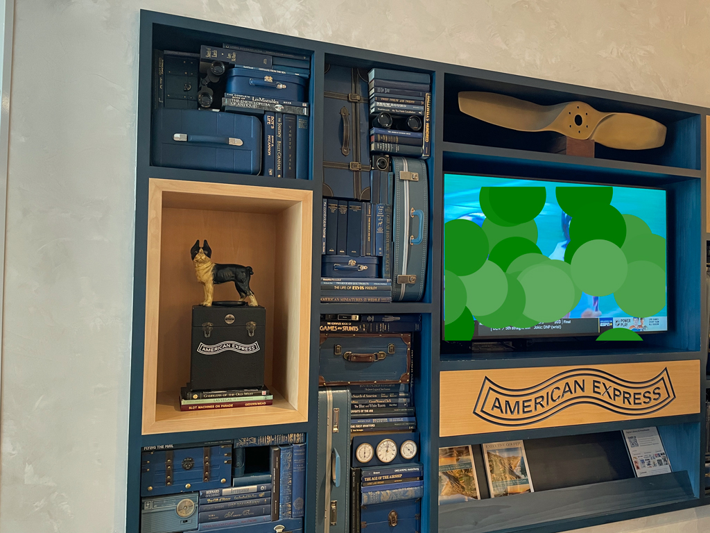 American Express legt viel Wert auf das Design. Beim Dekor wurde viel mit Holz gearbeitet. Ansonsten mit Grau/Blau sowie Weiß und Rot als Akzentfarben. Immer wieder erinnert etwas an American Express. Und fast jede Lampe ist eine Designerlampe.