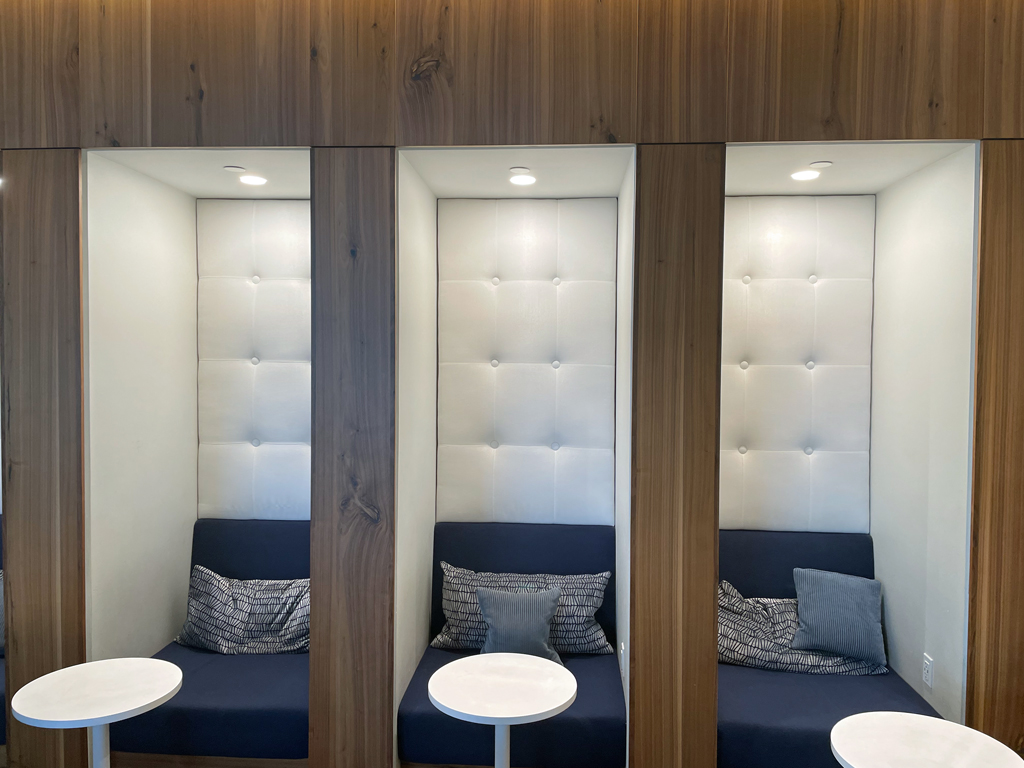 Wer in Ruhe arbeiten oder telefonieren möchte, kann sich in geschlossene Telefonräume zurückziehen. Als ob das jemand machen würde. In der Lounge wird überall (laut) telefoniert, gerne auch mit Video.
