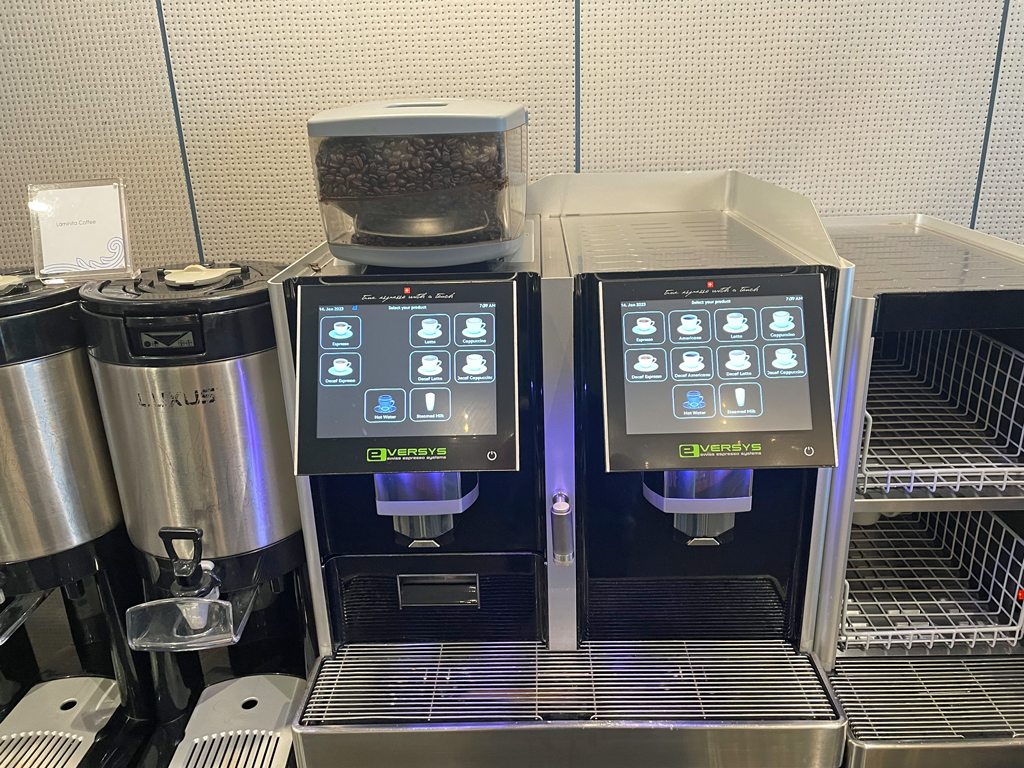 Heißgetränke kann man an einem Vollautomaten ziehen, heißes Wasser gibt es aus Thermoskannen. Genauso wie koffeinfreien Kaffee.