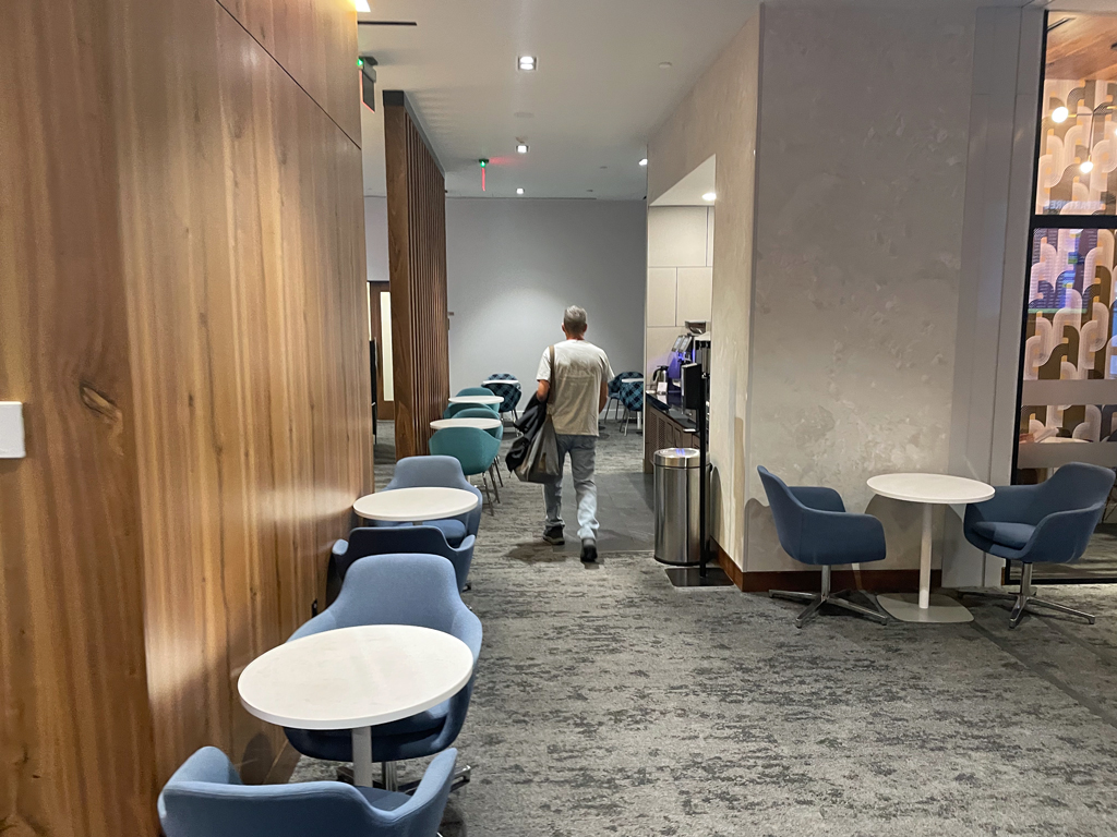 Obwohl die Lounge groß ist, ist sie optisch durch Vorsprünge und Raumteiler in verschiedene Bereiche aufgeteilt. Außerdem ist es meist so, dass man den Blick nicht geradeaus auf den Blick anderer Loungebesucher ausgerichtet hat. Dadurch entsteht die Illusion von erhöhter Privatsphäre.