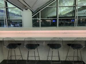 Die American Express Lounge gehört zu den Hongkong Lounges, die als offener Raum eine Etage über dem eigentlichen Abflugbereich liegt. Daher bekommt Ihr dort auch die volle Lautstärke des Terminals mit. So richtig zum Entspannen lädt die Lounge auch darüber hinaus nicht ein. Dafür, dass jeder Fluggast mit American Express Platinum oder Centurion Kreditkarte hier rein darf, gibt es erstaunlich wenig Sitzplätze. Langes Verweilen kann hier auf Grund der beschränkten Kapazitäten nicht gewünscht sein. Und so laden die Metall-Stühle und -Hocker auch kaum dazu ein.