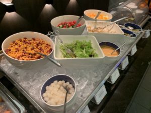 Das liegt vornehmlich daran, dass es keine Speisen a la Carte, sondern nur ein Büffet gibt. Dieses war zwar klein, aber bot doch leckeres Essen. So gab es bei meinem Besuch am frühen Abend etwas Fingerfood (panierte und frittiere Garnelen und Paprika), vollwertige Gerichte (Penne und frittiertes Hähnchen) und diverse Salate. Auch etwas Nachtisch stand zur Verfügung. Das Dessert-Büffet war jedoch zu dem Zeitpunkt etwas geplündert.