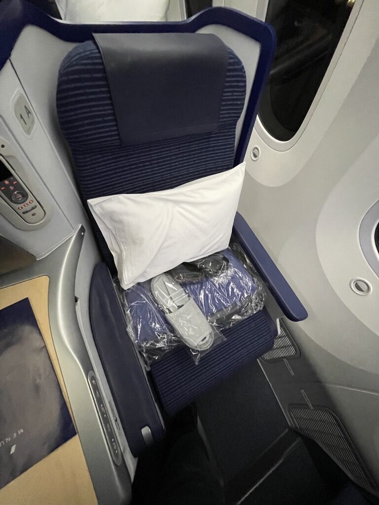 Ich konnte in meiner Buchung tatsächlich Sitzplatz 1A auswählen, welcher den Vorteil hat, dass er dem Fenster zugewandt ist und damit deutlich mehr Privatsphäre als die C,D,G oder H Sitze bietet. Dazu kommt noch, dass der Fußraum in der ersten Reihe etwas größer ist, weshalb ich diesen Sitz tatsächlich für den besten in der ANA Business Class halte.