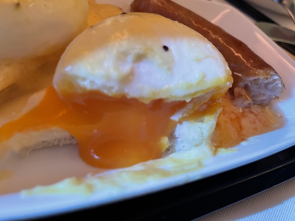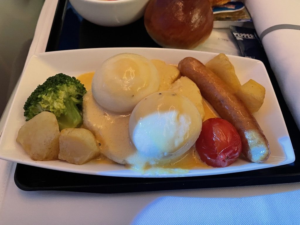 Mit dem Kaffee fragte man mich auch direkt, ob ich denn frühstücken wollte und da ich von der Option der Eggs Benedict im Flugzeug fasziniert war (und hier auch gewisse Zweifel hatte, dass dies funktionieren kann), habe ich diese bestellt.