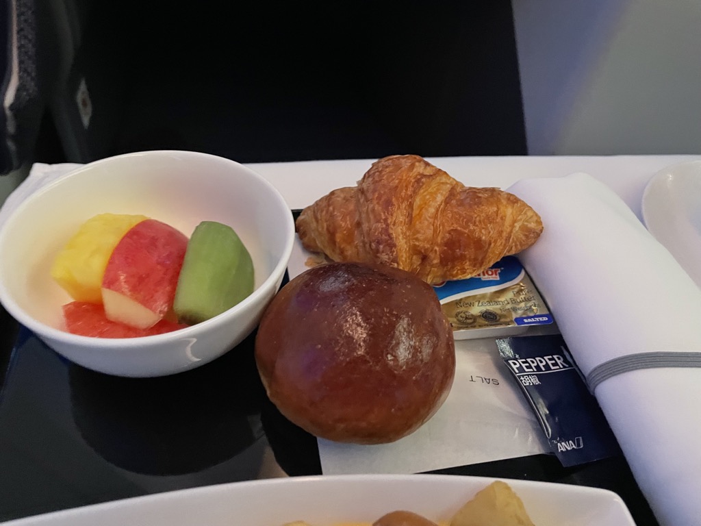 Auch hier kam das Essen wieder auf einem Tablett, mit etwas frischem Obst und Backwaren. Während das Essen gut aussah, hat es mich sehr verwundert, dass ANA in der Business Class auf kleine Einweg Butter, sowie Salz und Pfeffer Tütchen setzt.