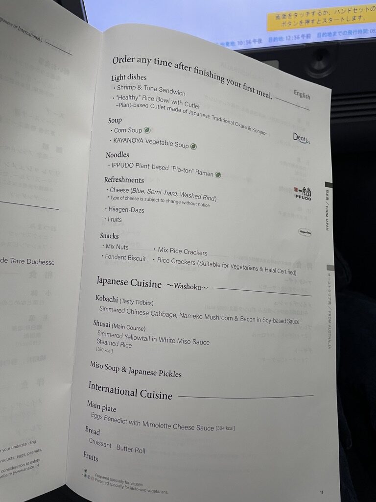ANA hat in der Business Class ein durchaus spannendes Service Konzept, denn der erste Service findet direkt nach dem Start statt und ist nicht flexibel. Alles weitere kann von der Karte „on demand“ während des gesamten Fluges bestellt werden, was ich keine schlechte Idee fand.