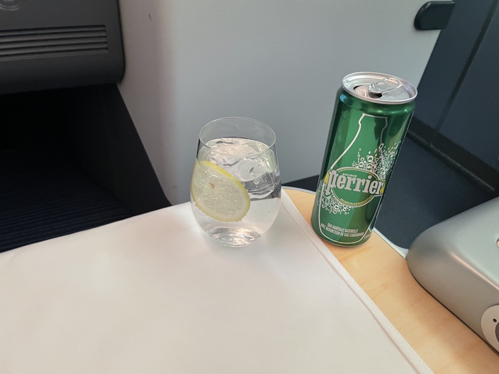 Weniger als 10 Minuten nach dem Start hat die Crew bereits mit dem Service begonnen und direkt die Tische mit Tischdecken eingedeckt. Kurz darauf stand auch schon mein bestelltes Wasser, wie gewünscht mit Eis und Zitrone, bei mir.