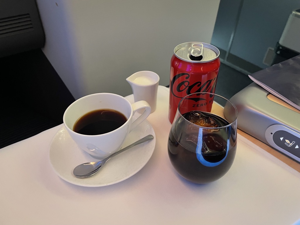 Nachdem es ein Nachtflug war, habe ich aus der Snack Karte leider nichts bestellt, sondern die meiste Zeit geschlafen. Etwa 90 Minuten vor der Landung in Sydney bin ich in der langsam hell werdenden Kabine wach geworden und habe mir meine morgendliche Ladung Koffein bestellt, die auch prompt geliefert wurde.