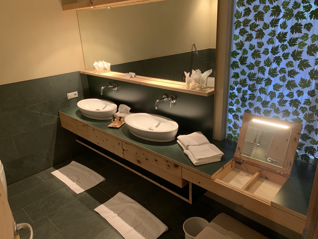 Das Badezimmer war mit einem Doppelwaschbecken und viel Ablagefläche ausgestattet. Neben der großzügigen Walk In Dusche befand sich im Bad noch eine Badewanne und ein Schminktisch. Sogar eine ganze Reihe Amenities erwarteten uns im Badezimmer, was wir immer sehr zu schätzen wissen.