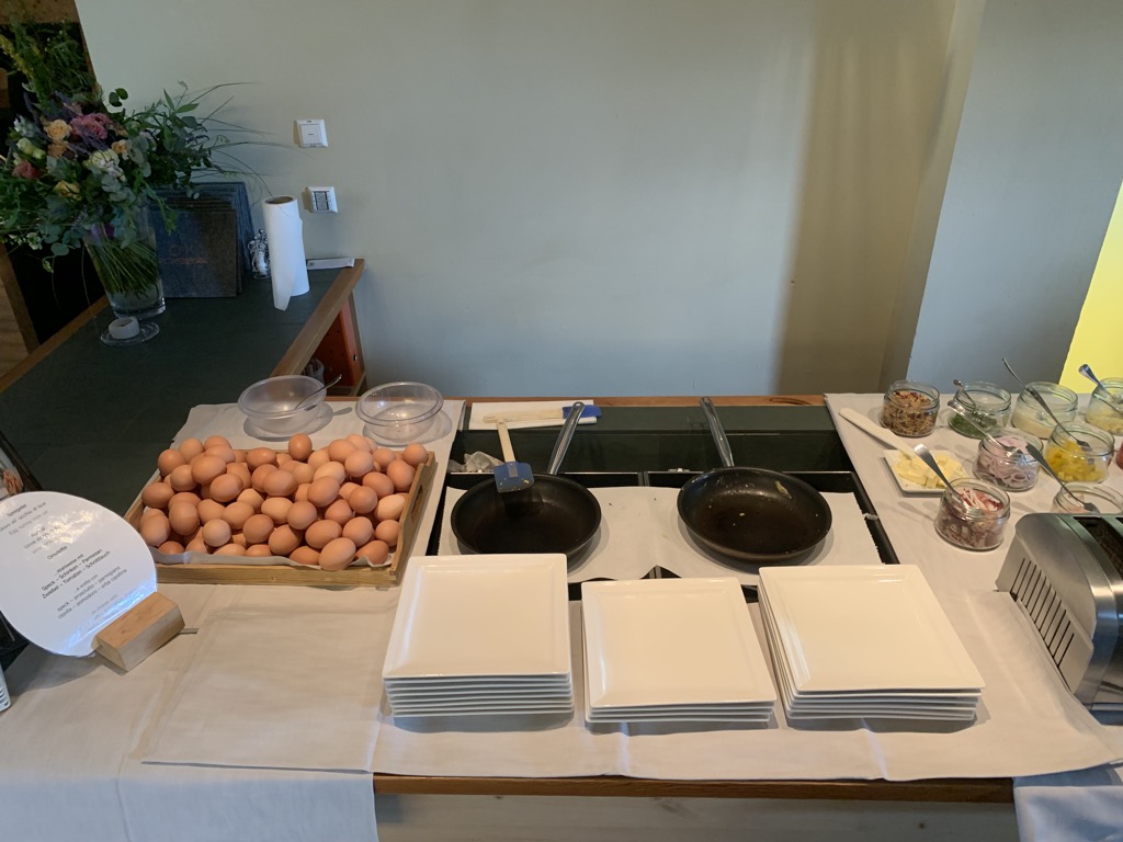 Das Frühstück konnte man auch draußen auf der Terrasse einnehmen. Hier war das Angebot beeindruckend vielfältig. Besonders hervorzuheben sind sicher die Saftstation, an der man frische Säfte und selbstgepresste Säfte bekommen konnte, sowie das Live-Cooking. Hier wurden vor allem Eierspeisen, aber auch Pancakes zubereitet.