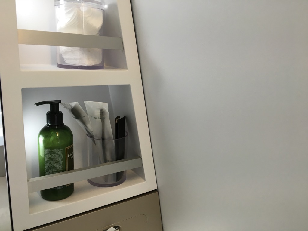 Das Badezimmer selbst ist angenehm groß und verfügt neben einer Sitzbank zum Umziehen auch über Fenster. Auch eine ganze Reihe von Amenitys standen im Bad bereit. Das Badezimmer war auch den ganzen Flug über in einem tadellosen Zustand.