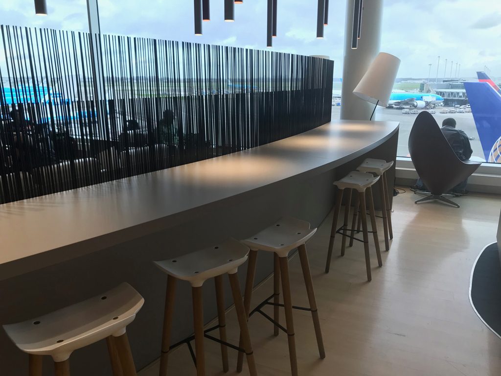 Besonders schön sind die bequemen Sessel, die einen direkten Vorfeldblick ermöglichen. Zudem steht ein Bereich mit Barhockern und Esstischen zur Verfügung.