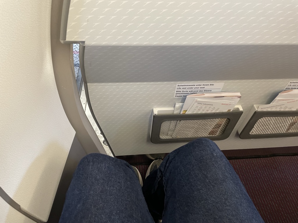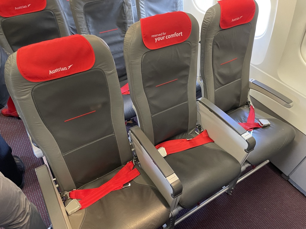 Ich finde die roten Akzente von Austrian Airlines durchaus ansprechend, auch wenn man sonst keinen großen Unterschied zur Lufthansa feststellen kann. Anders als beim Airbus A320neo ist die erste Reihe im Airbus A320ceo übrigens sehr nah an der Bulkhead, wodurch man nicht so viel Beinfreiheit hat, wie man es sich vielleicht wünschen würde.
