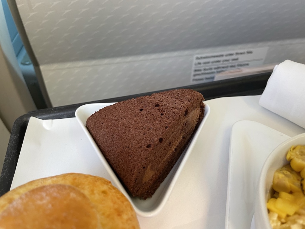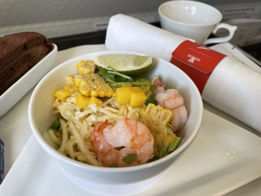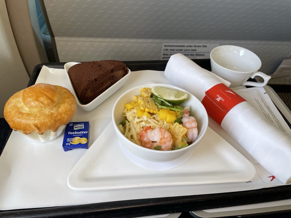 Nach dem Start hat man direkt mit dem Service begonnen, was bei der kurzen Flugzeit wenig überraschend ist. Zuerst wurden die Speisen verteilt, die in diesem Fall aus einem kalten Papaya-Salat mit Garnelen und einem Schokoladenkuchen bestanden. Auch ein Brotkorb mit gutem, frischem Brot wurde gereicht und war wohl das Highlight des Essens.