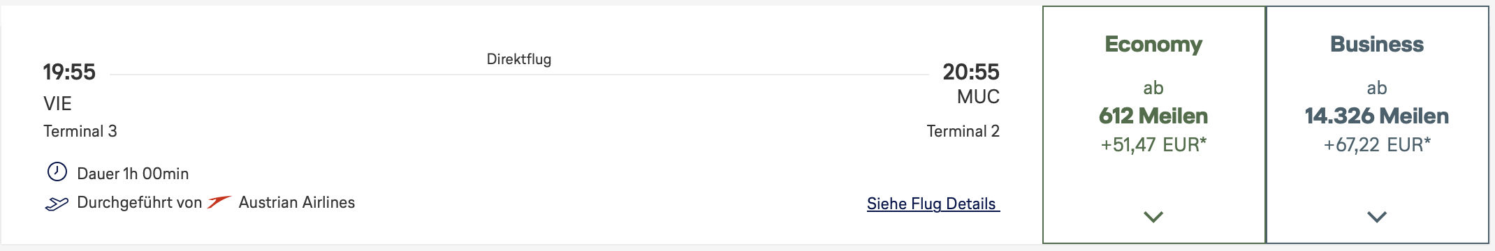 Meilenflüge sind hier oft kein schlechter Deal, insbesondere wenn man bedenkt, dass man Miles-&-More-Prämienmeilen auch einfach kaufen kann (aktuell auch mit einem Bonus von 50 %, was einen attraktiven Preis ergibt).
