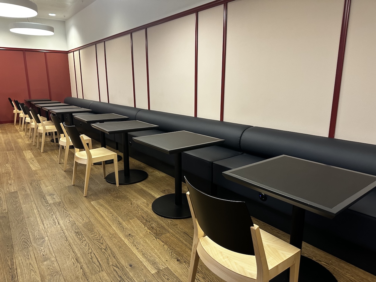 Ich habe es mir an einem hohen Tisch gemütlich gemacht, mit einem Laptop wird es hier allerdings etwas eng. Wer telefonieren möchte oder sich etwas abschirmen will, kann eine der beiden Telefonkabinen nutzen.