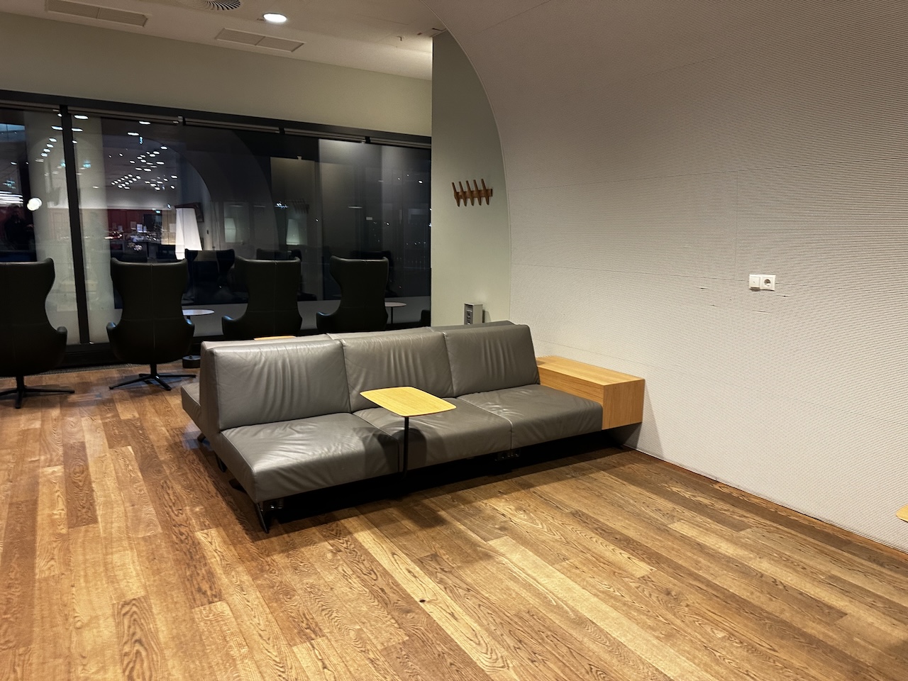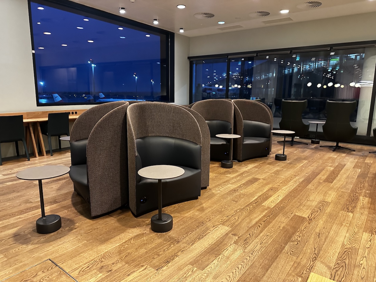 Ich war morgens zu sehr früher Stunde da, daher war es noch dunkel. Sonst bekommt man hier auch etwas Tageslicht ab und kann auf das Vorfeld gucken.
