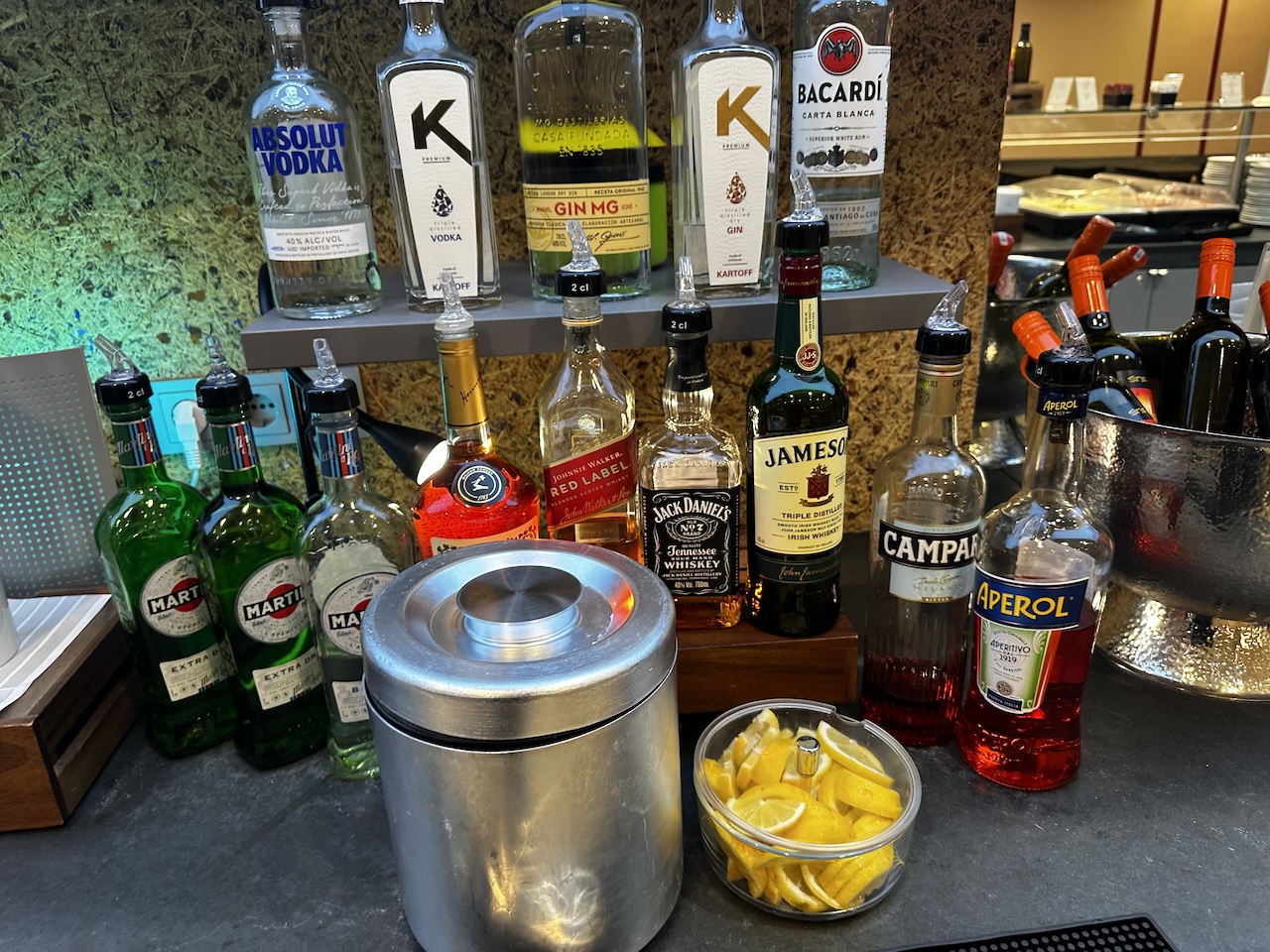 Die Bar war schon zur Öffnung der Einrichtung voll bestückt und ohne Einschränkung verfügbar. Neben den üblichen Alkoholika wie Wodka, Rum, Campari, Whiskey, Aperol und Martini gab es auch zwei verschiedene Gin-Sorten.