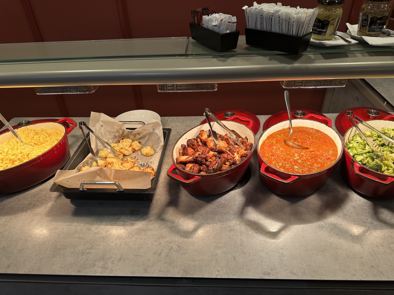 2. Zumindest morgens die schlimmste Lounge im LH System inzwischen. Erstmal ist das Essen grausam. Was ist das für ein Frühstück? Chicken Wings, echt jetzt? Und anscheinend gibts auch immer genau dasselbe. Also da hat jetzt LH Sen Lounge mehr Auswahl. Es gab ja nicht mal Saft.