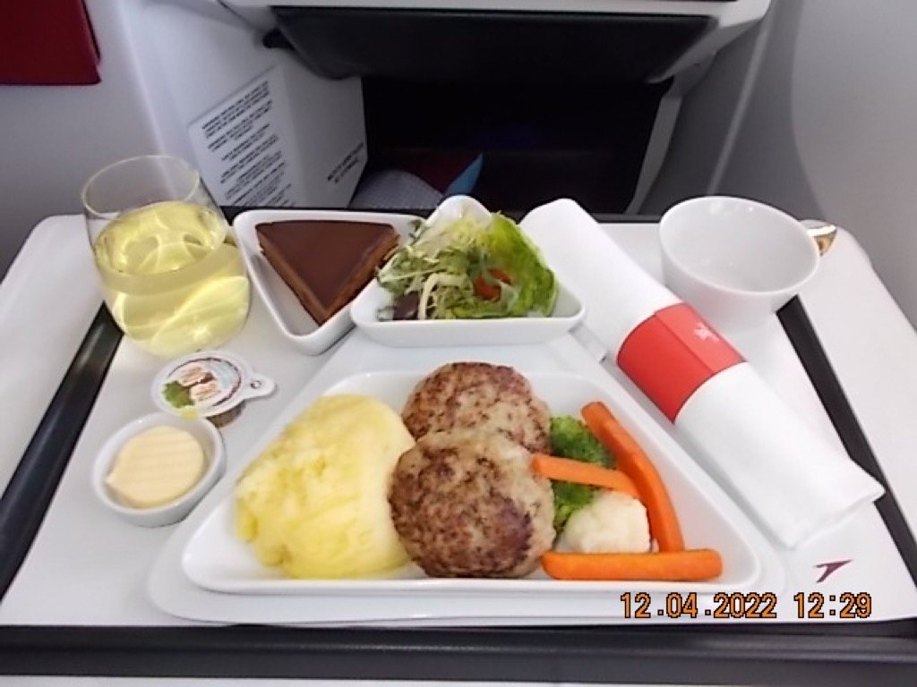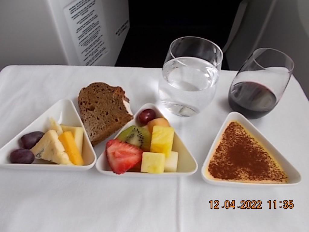 Nach Erreichen der Reiseflughöhe wurde zügig mit dem Service bekommen. Zuerst wurden heiße Tücher verteilt. Eine Getränkerunde mit Nüssen gab es nicht, sondern man konnte direkt vom Trolley die Vorspeise und die Getränke auswählen. Ich entschied mich für Mineralwasser, ein Bier und einen Weißwein, den man mich auch probieren ließ. Während des Essens wurden stets Getränke nachgeschenkt, Brot nachgereicht und gefragt, ob alles zu meiner Zufriedenheit sei. Zusammen mit dem Purser führten zwei weitere Flugbegleiterinnen den Service durch. Als Hauptgericht wählte ich Lachs mit Spinat. Zum Dessert fragte ich nach Tiramisu und Käse und ich bekam noch frische Früchte.
