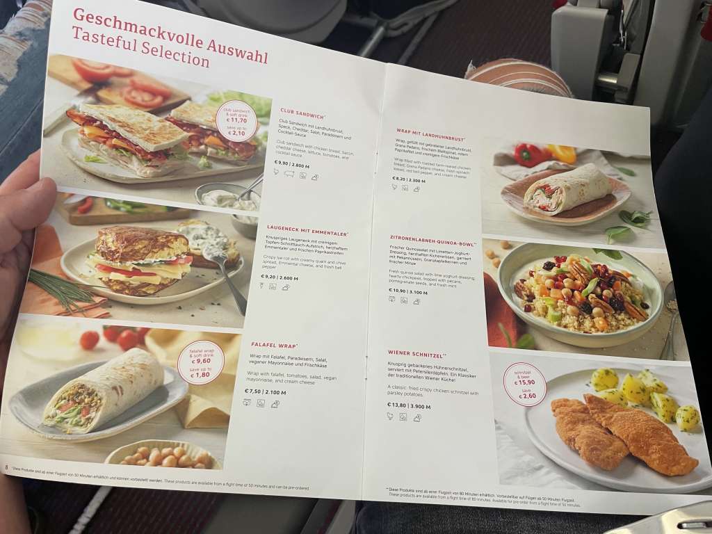 Das Catering-Angebot an Bord nennt sich „Austrian Melangerie“ und bietet wenig inspirierende Speisen, die zum Kauf angeboten werden. Tatsächlich wird das Angebot von Sandwiches und Wraps dominiert. Dass Falafel (im Wrap) und eine Quinoa-Bowl nicht fehlen dürfen, ist selbstverständlich und passt zum Zeitgeist. Seit der Einführung von „Austrian Melangerie“ gibt es auch immer ein „Wiener Schnitzel“, welches allerdings aus Hähnchenfleisch besteht. Die einzelnen Optionen kosten zwischen 7 und 14 Euro. Zusätzlich gibt es natürlich noch allerhand Snacks und Getränke.