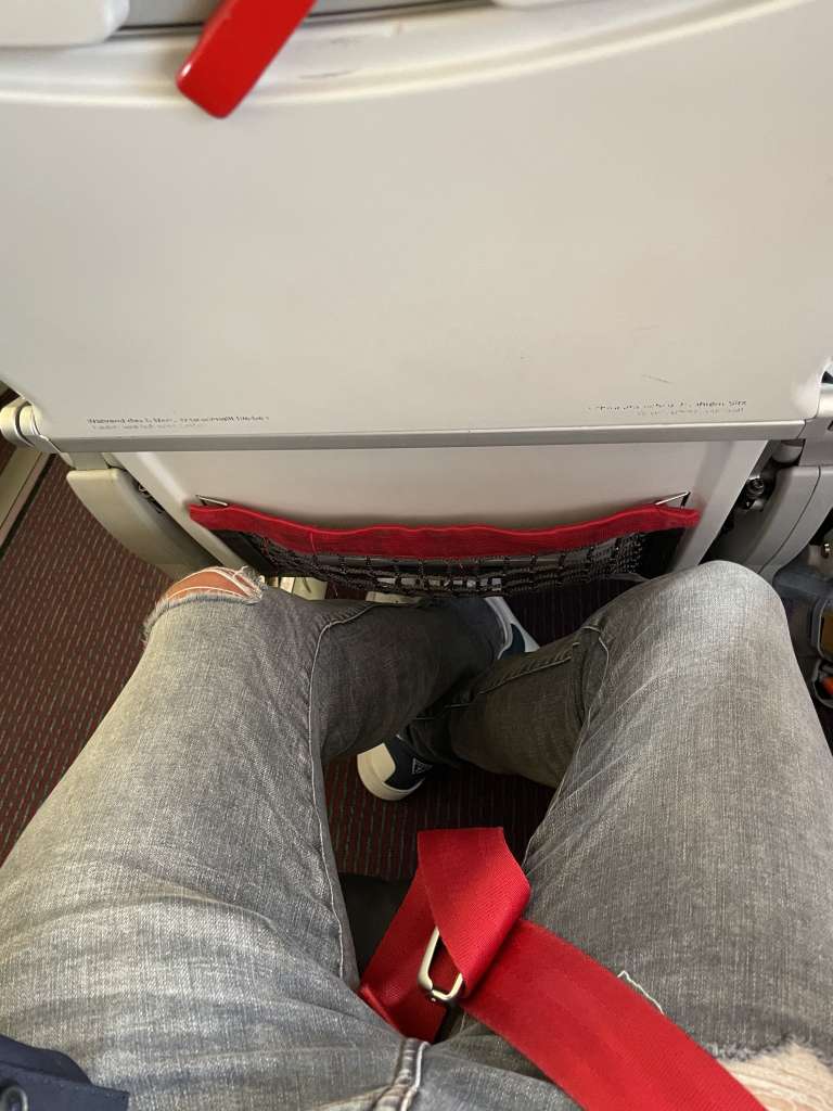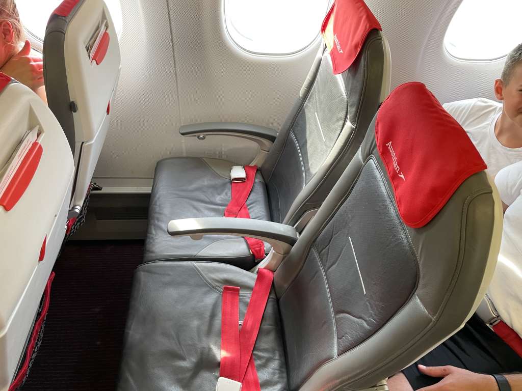 Als Familie mit zwei Kindern haben wir immer wieder die Herausforderung, dass beide Kinder am Fenster sitzen möchten. Das steht meist im Konflikt dazu, dass die beiden Elternteile nicht auf dem Mittelsitz herumlungern möchten. Diese Herausforderung besteht bei der Embraer E-195 nicht, da das Flugzeug mit insgesamt 120 Sitzen in einer 2-2-Bestuhlung ausgerüstet ist. Man kann also nur am Gang oder am Fenster sitzen. Für uns also perfekt.