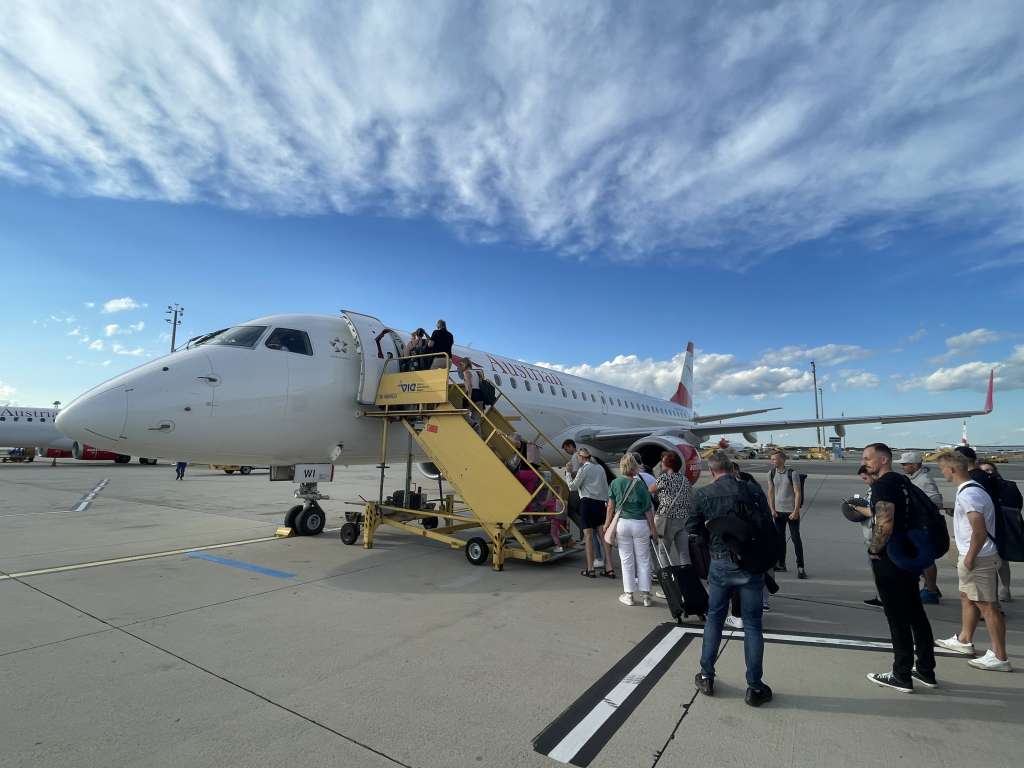 Als dann der Bus endlich kam, erreichten wir nach ein paar Minuten die Embraer E195 mit der Registrierung OE-LWI und konnten über die Treppen einsteigen.