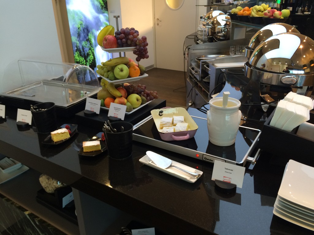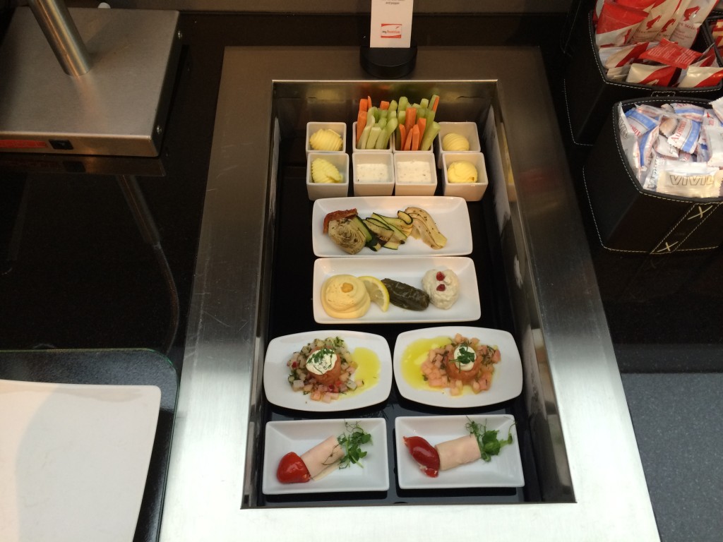 Wie man es sich bei Austrian Airlines denken kann, wird das Lounge Catering von DO&Co durchgeführt. Ein großer Teil der Lounge wird vom Buffet eingenommen. Wie man es von DO&Co kennt sind die Speisen österreichisch-mediterran geprägt.