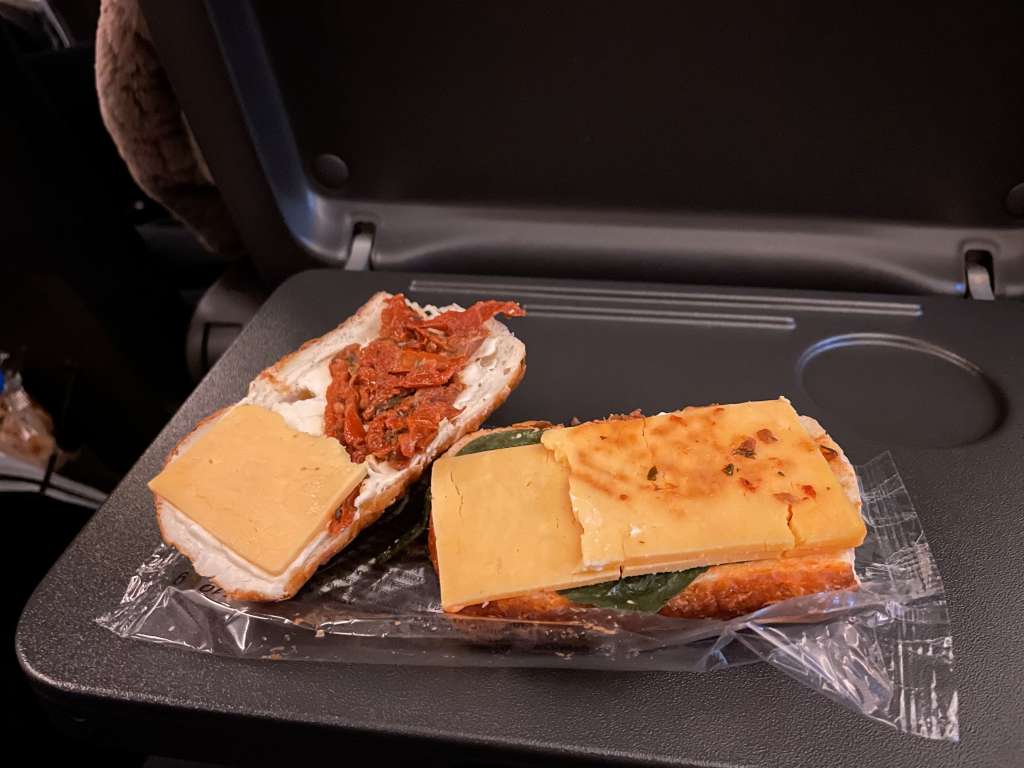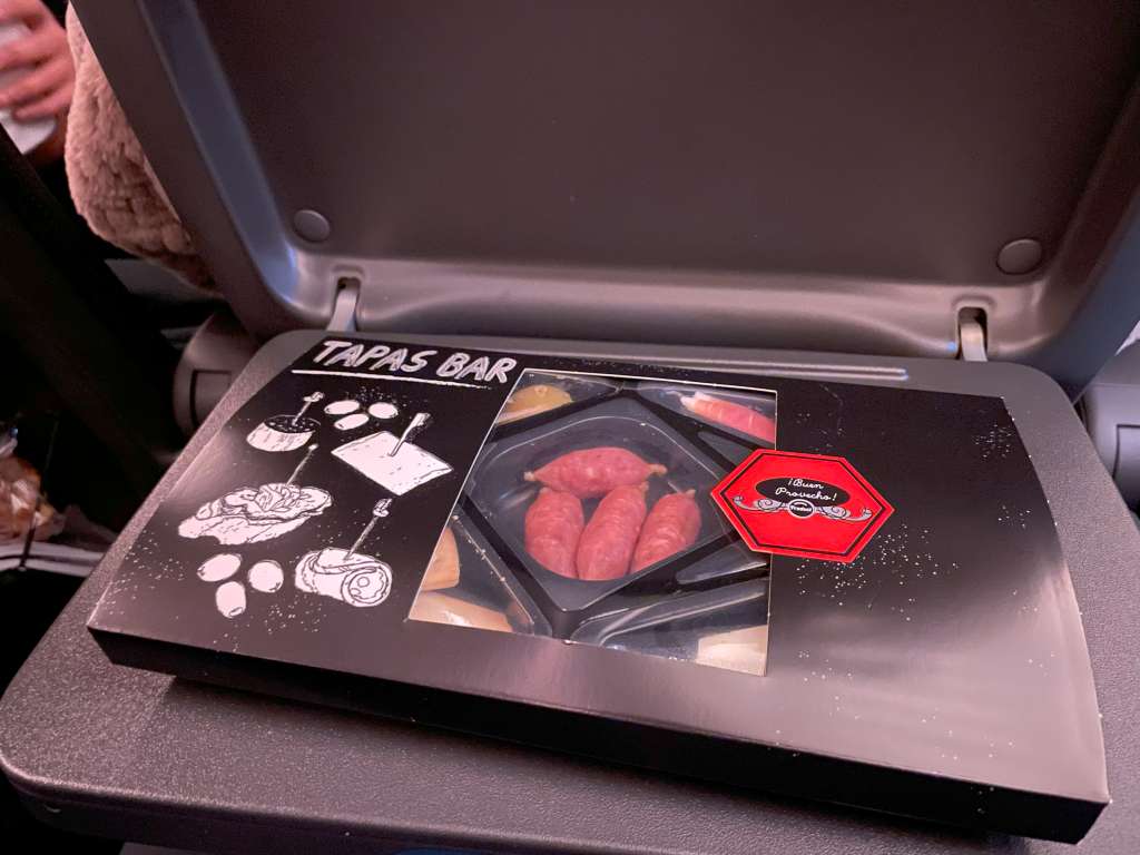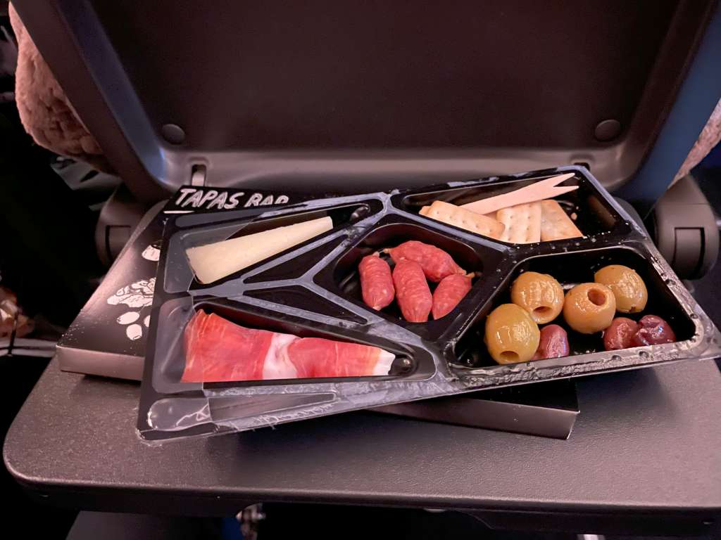 Um 23:45 Uhr begann dann auch der Service. Verteilt wurde ohne Auswahl eine mediterran angehauchte und mit Käse belegte halbe Laugenstange. Im Anschluss gab es noch einen Becher Softdrink nach Wahl, bei dem ich direkt die berühmte Tapasplatte (die, die sonst niemals geladen ist) als Alternative mitbestellte. Nachdem mein Tag bisher nur aus zwei Spiegeleiern und einer Wurst bestand, gönnte ich mir diese kleine Belohnung.