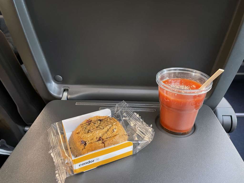Condor bot auf diesem Flug eine kostenlose Notversorgung an. Ein halbes Sandwich, ein Cookie und kostenfreie alkoholfreie Getränke sorgen dafür, dass niemand auf dem Flug verhungert oder verdurstet. Mehr aber auch nicht.