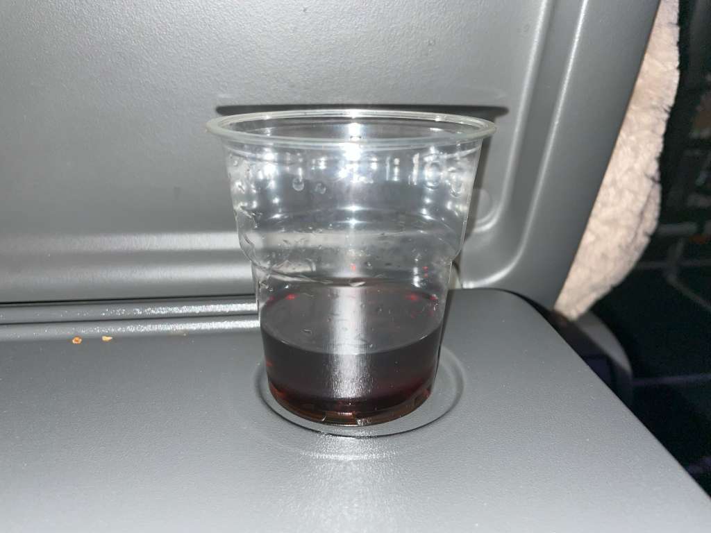 Nach dem ersten etwas längeren Nickerchen wachte ich um 1:25 Uhr wieder auf und entschloss mich nachzuhelfen. Mein letzter Schluck Hennessy Paradis von einem Emirates-First-Class-Flug ruhte in meinem Amenity Kit. Zumindest bis er in einen Plastikbecher wanderte und mir, begleitet von einer Folge der Drei ???, den Rest gab.