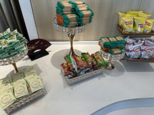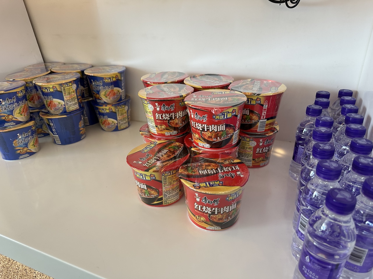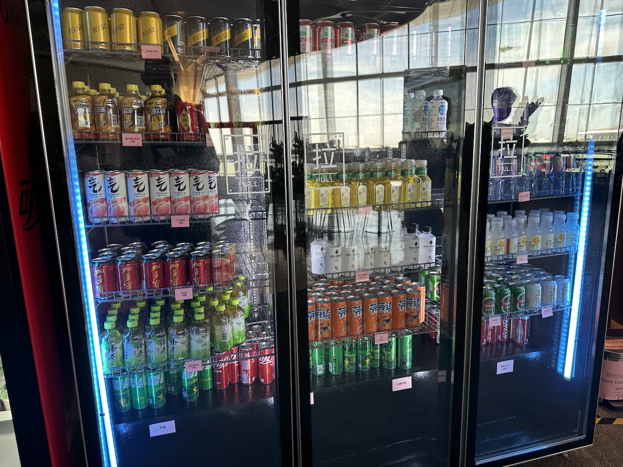 Das Sortiment kann sich sehen lassen, wie in vielen ähnlichen Einrichtungen in Asien ist die Auswahl sehr üppig. Da gibt es zunächst diverse Snacks, Obst und Softdrinks, die man sich an mehreren Stationen nehmen kann.