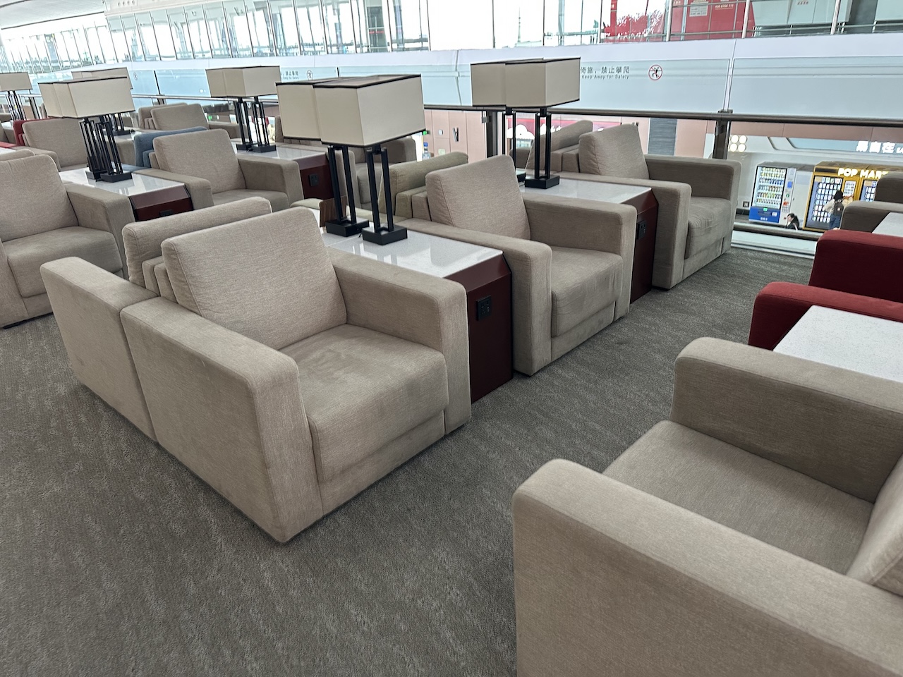 Die Lounge ist komplett offen gestaltet. Alle Zonen sind mehrfach etwas voneinander abgetrennt, es gibt aber keine Wände, daher bekommt man das Geschehen im Terminal mit. Es war aber keineswegs zu laut. Im Eingangsbereich ist ein großer Rezeptionstresen, von hier kann man auch auf das Vorfeld blicken.