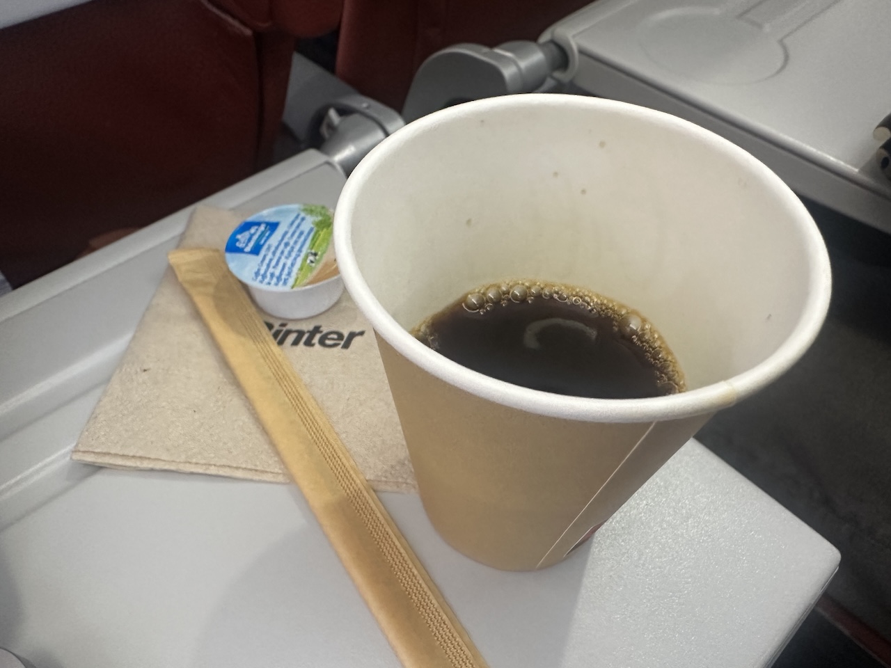 Nach dem Start wurden Desinfektionstücher für die Hände verteilt. Die Flugbegleiterinnen sind dann zu dritt durch die Kabine und haben zunächst bei jedem Passagier den Tisch mit einem Papierblatt „eingedeckt“, Servietten verteilt und Getränke abgefragt.