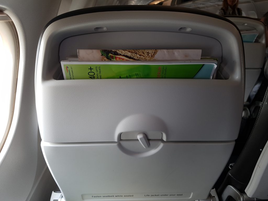 Der Sitzabstand ist absolut akzeptabel und wie es bei Economy Class Sitzen auf der Kurzstrecke inzwischen üblich ist, hat man die Literaturtasche nach oben verlegt um den Passagieren etwas mehr Beinfreiheit bieten zu können.