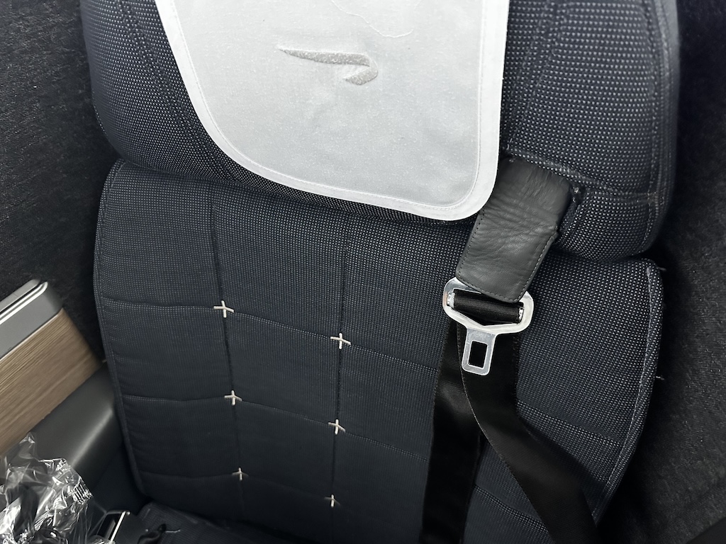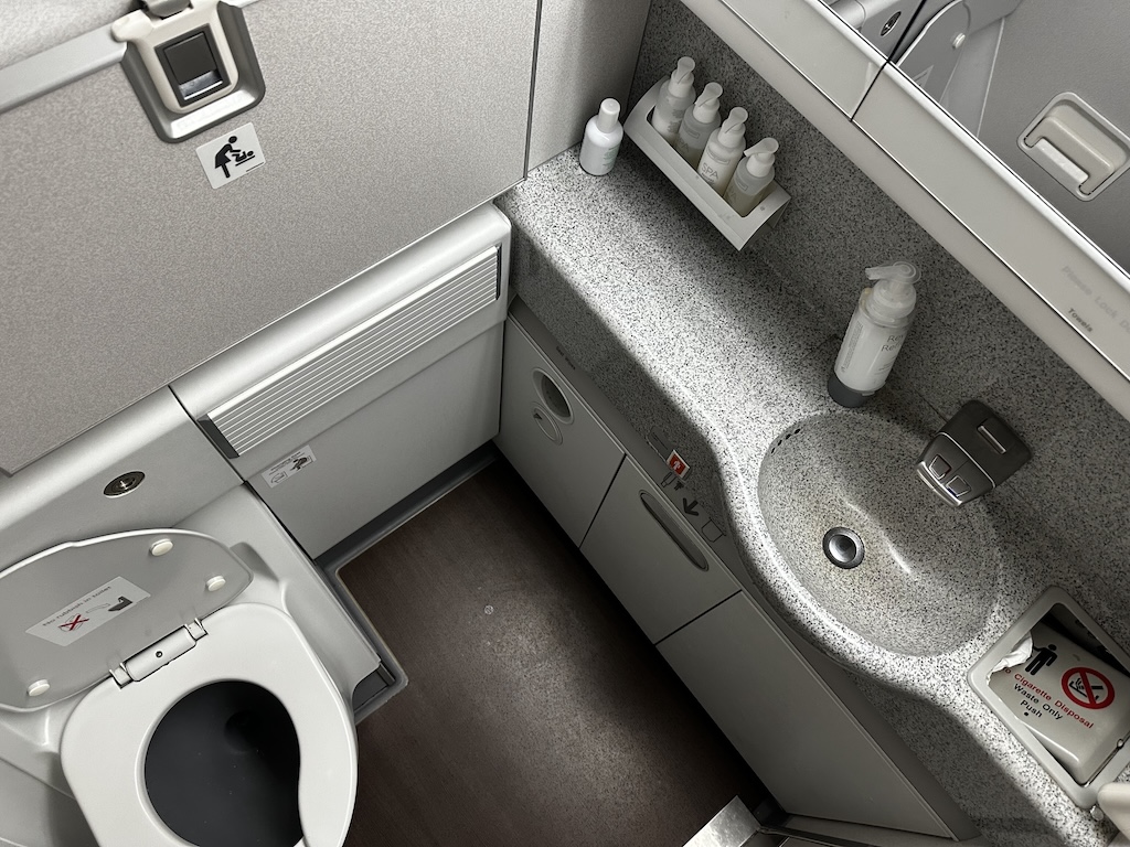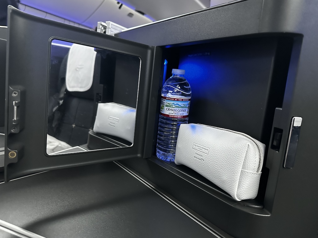 Das Amenity Kit ist mit einigen Pflegeartikeln und Socken sowie Schlafbrille im Ablagefach verstaut, welches einen eingebauten Spiegel hat. Dort ist auch eine Wasserflasche. Auf dem Sitz lagen schon vor dem Start eine Tasche mit der Decke und ein Kissen auf dem Sitz bereit.