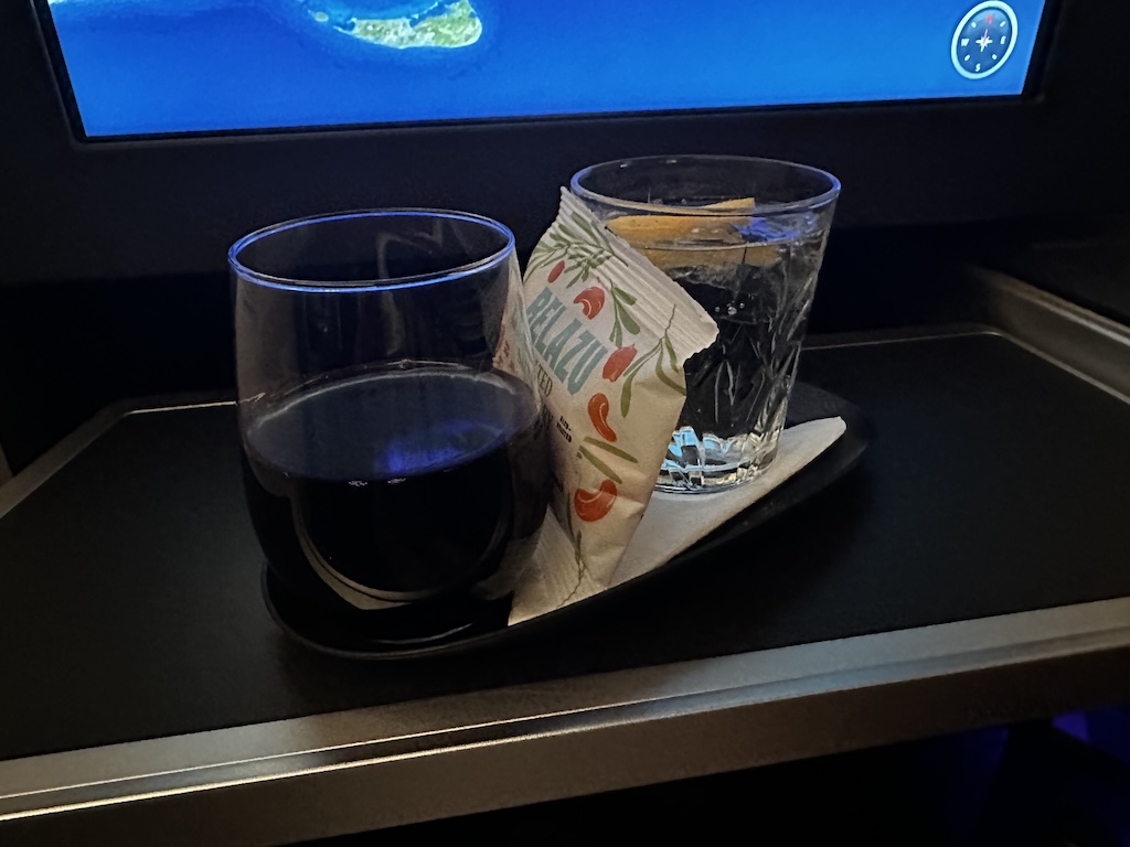 Viele Passagiere haben bereits vor dem Start gegessen und nur einen eingeschränkten Service in Anspruch genommen bzw. komplett darauf verzichtet. Für alle gab es am Boden noch ein Willkommensgetränk.