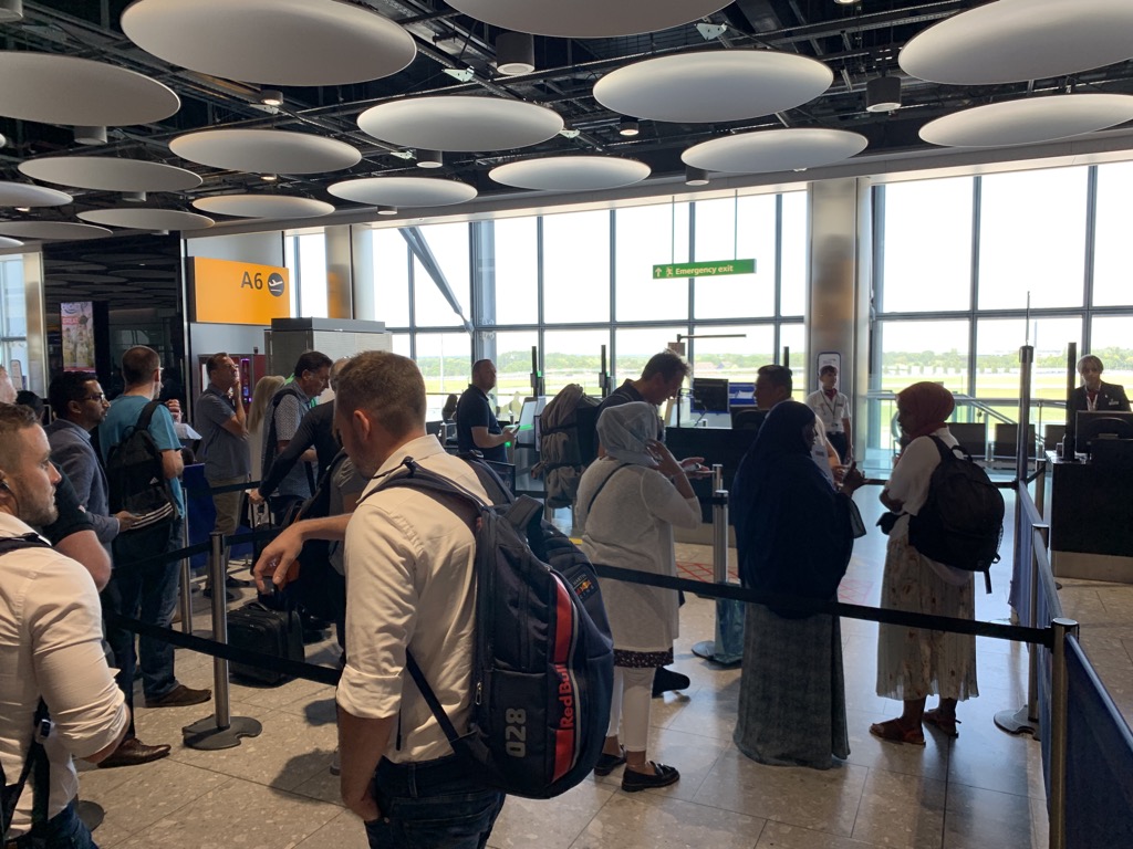 British Airways hat ein recht gut organisiertes Boarding System, bei welchem die Passagiere in fünf Gruppen einsteigen. Hierfür sind am Gate immer Schilder und Schlangen aufgebaut, sodass sich die Passagiere schon in die entsprechenden Gruppen einordnen können, wenn sie gerne Schlange stehen wollen und die Briten machen dies offensichtlich genauso gerne wie wir Deutschen.