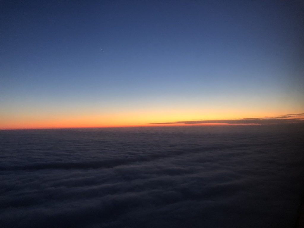 Die Crew verbreitete gute Laune und führte die Sicherheitshinweise vor. Nach dem Start konnten wir noch etwas die untergehende Sonne beobachten, immer wieder ein herrlicher Anblick. Besonders wenn noch kurz vorher draußen Nebel und Regen dominierten.