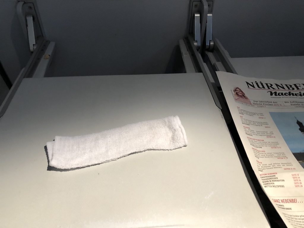 Während der Service in der Galley vorbereitet wurde, reichte uns eine Flugbegleiterin ein heißes Tuch. In der Economy Class gibt es den Bordservice nur gegen Cash, das Angebot erschien angemessen. In der Business Class war alles inklusive, das breite Sortiment beinhaltete auch Champagner und wurde sehr gut angenommen.