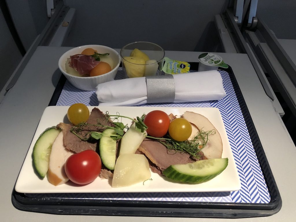 Ich hatte in meinem Profil den Wunsch eines fettarmen Menüs gespeichert, das Tablett war von der Menge her ausreichend. Leider stellte sich später heraus, dass ich auf allen vier Flügen der Reise haargenau die gleiche Mahlzeit bekommen sollte. Etwas Abwechslung hätte ich mir gewünscht, denn das reguläre Angebot wechselte auf jedem der Flüge und es standen immer zwei Optionen zur Wahl. Das Menü an sich war ansehnlich und geschmacklich gut, parallel wurde ein Brotkorb mit warmem Gebäck gereicht.