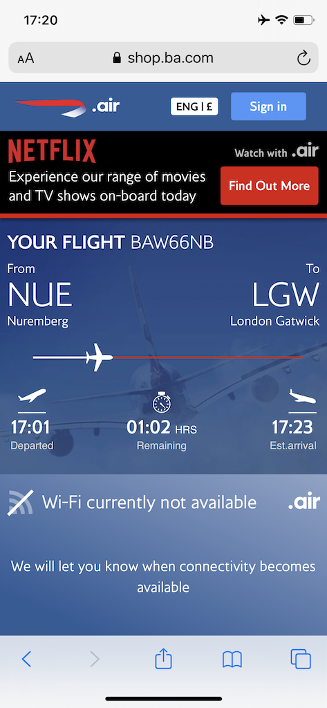 Das Flugzeug war mit einem WLAN Hotspot ausgestattet, das kleinste Paket konnte man für etwa 3 Pfund buchen. Mir reichten auf dem kurzen Flug die bereitgestellten Zusatzinformationen die man im Browser sehen konnte. Zeitungen und Zeitschriften wurden mit Ausnahme des Bordmagazins an Bord von BA nicht angeboten.