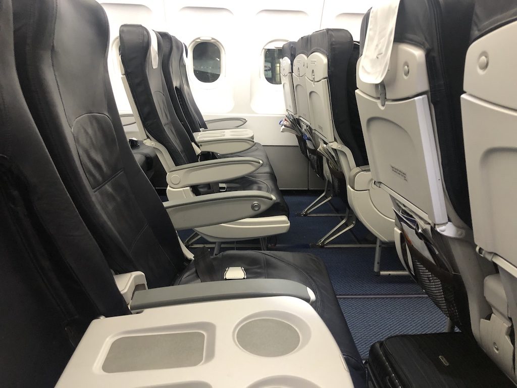 Wie auf Schmalrumpfflugzeugen für Flüge innerhalb Europas üblich, handelt es sich in der Business Class um einen regulären Sitz in einer 3-3 Anordnung. Der Mittelsitz ist geblockt und die Kabine zur Economy Class ist mit einem Vorhang getrennt. Die Beinfreiheit war absolut akzeptabel, die Kabine fanden wir im sauberen Zustand vor. Die Tische der ersten Reihe sind an der Wand befestigt und eignen sich durch die Größe herrvoragend zum Arbeiten und Essen.