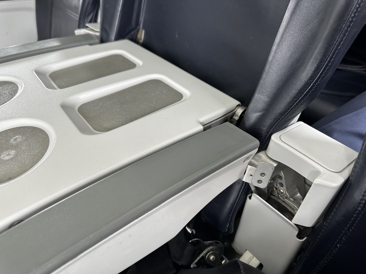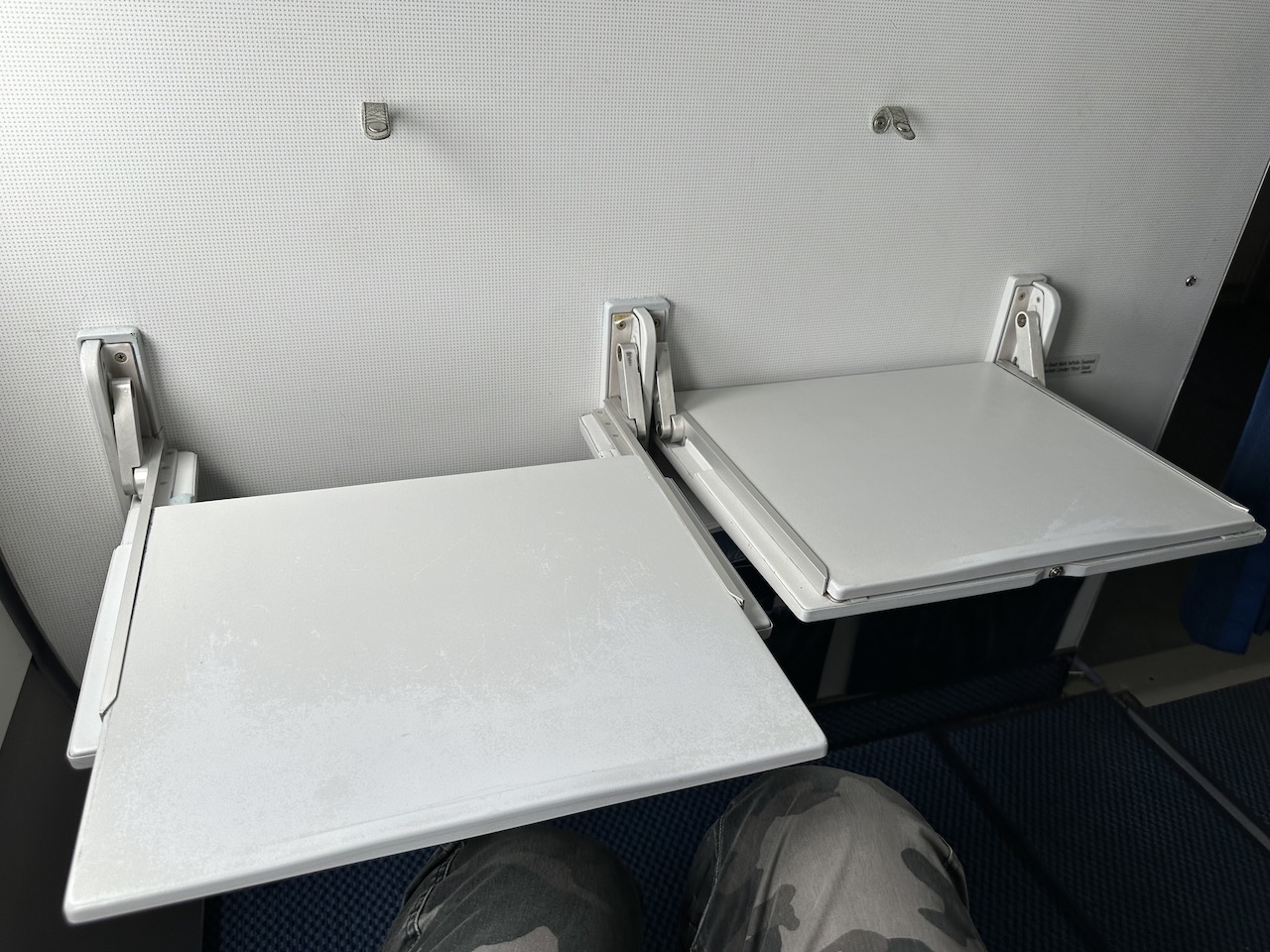 Die Sitze waren ziemlich durchgesessen, für einen so kurzen Flug aber kein wirklicher Grund sich zu beschweren. Die Abtrennung der Klassen war in dem Airbus A319 zwischen den Reihen 3 und 4, dadurch gab es 12 Plätze in der Business da auch bei BA die Mittelsitze im vorderen Bereich freigehalten werden. Hier sind kleine Klapptische installiert, die als Ablage dienen. Die Armlehnen können verstellt werden, was den Sitzbereich etwas vergrößert.