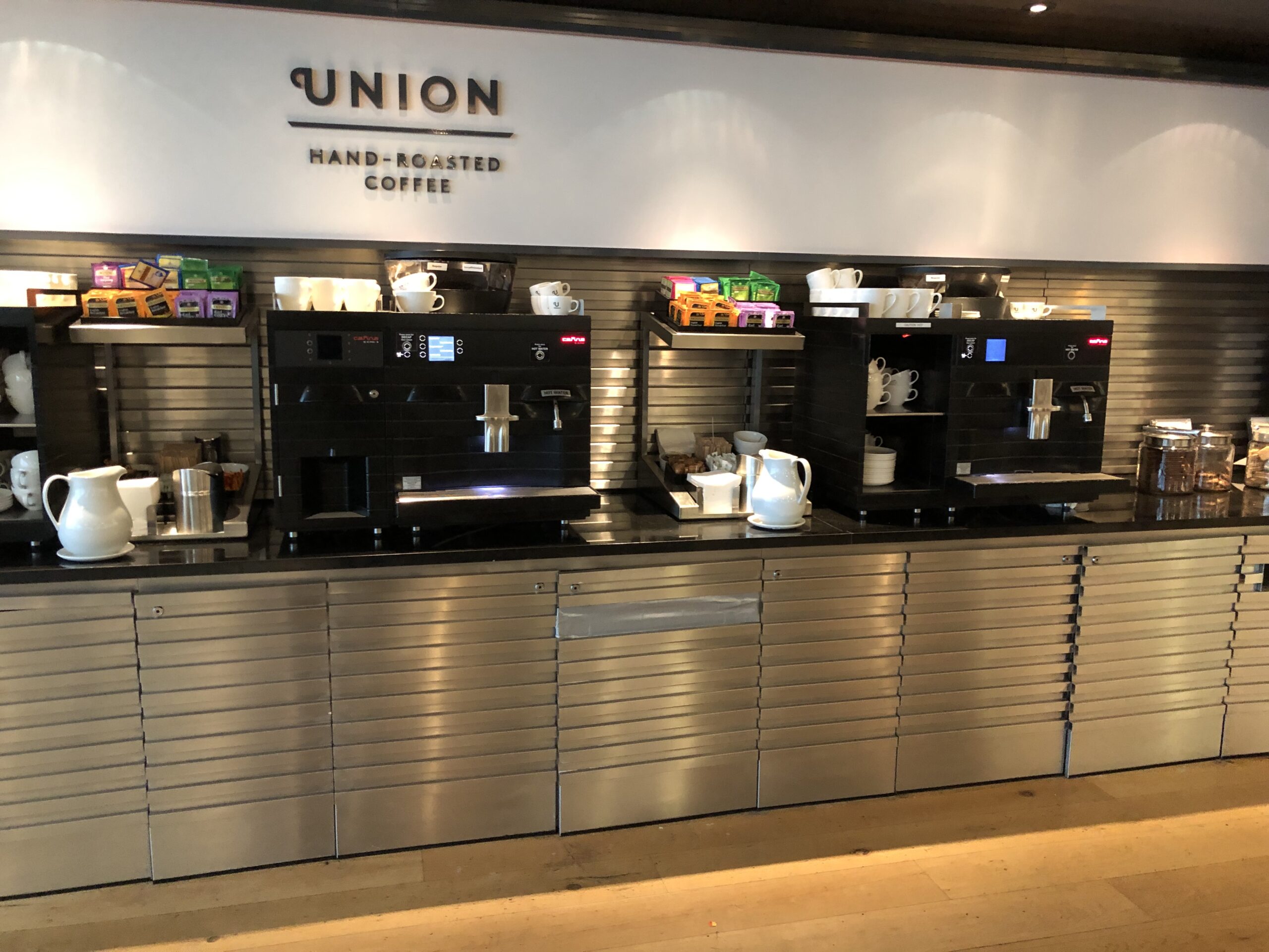 Während sich das Buffet auf die Mitte der Räumlichkeit konzentriert gibt es Kaffee und Getränke in allen Ecken. Das Internet war sehr schnell und stabil, Steckdosen gibt es reichlich und für mehrere gängige Stecker.