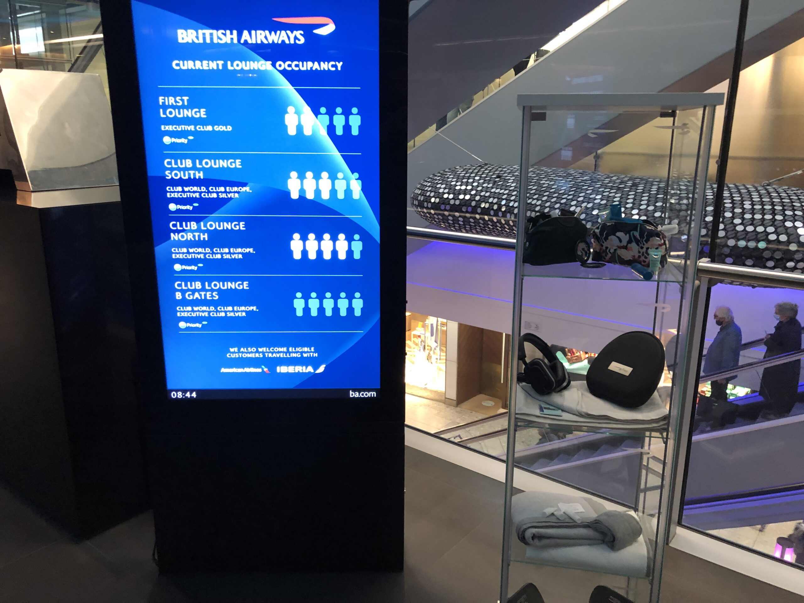 Im Terminal 5 unterhält British drei eigene Einrichtungen, die Lounge an den B Gates war heute zwar wenig frequentiert, ein Besuch der abgelegenen Räumlichkeit hätte allerdings einen größeren Umweg bedeutet. Daher blieb mit die Wahl zwischen North und South. Die Schlange bei North war etwas länger, anhand eines Monitors konnte ich erkennen, dass bei South etwas weniger los ist.