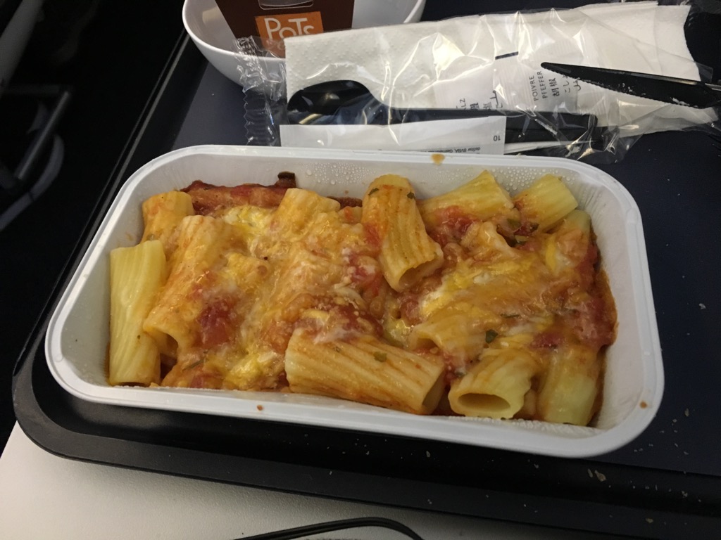 Nach der ersten Getränkerunde wurden das Abendessen serviert. Hierbei hatte man die Auswahl zwischen einem Pastagericht und einem Rindergeschnetzeltem, welches mich in seiner Beschreibung nicht besonders angesprochen hat. Direkt nach dem Wagen mit den warmen Essen, wurde auch noch eine weitere Getränkerunde serviert.